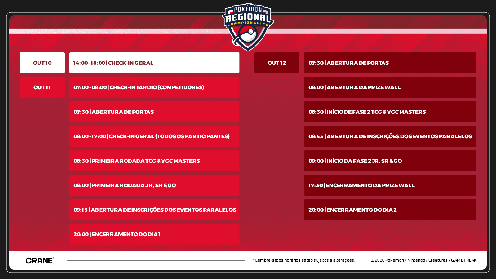 Nós estamos felizes em recebê-los em Belo Horizonte. Nas próximas semanas nós iremos anunciar a programação completa do Campeonato Regional Pokémon.
